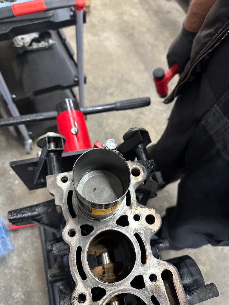 ピストンリングがついているのでピストンリングを縮めながらシリンダにハンマーの柄の部分を使って軽くたたきながら入れていきます。